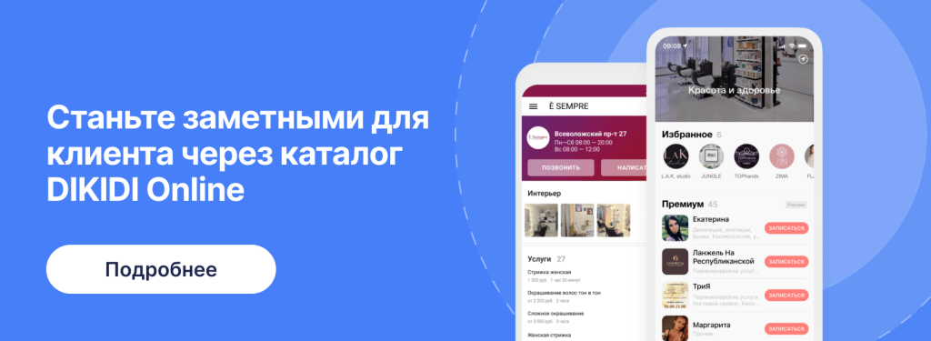 Когда салон подключает онлайн-запись, он становится видимым в каталоге DIKIDI Online. Это конкретная точка присутствия, где ваши услуги отображаются в удобном формате, а клиенты могут сразу увидеть доступное время и забронировать его.
