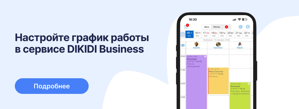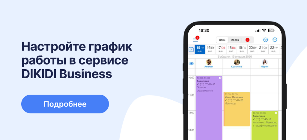 Для бизнеса с большим потоком клиентов и разнообразными услугами это особенно важно. В DIKIDI можно организовать расписание мастеров так, чтобы каждая смена была сбалансированной, а свободное время использовалось максимально эффективно, не создавая накладок и обеспечивая комфорт для команды.